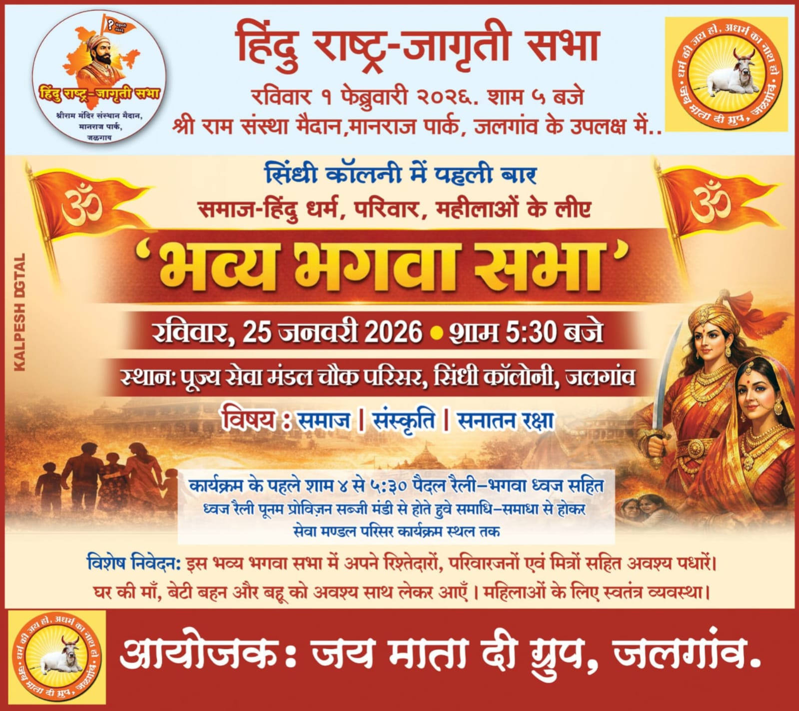 जलगाव: शहर में ‘हिंदू राष्ट्र-जागृति सभा’ के अंतर्गत ‘भव्य भगवा सभा’ का शानदार आयोजन किया जा रहा है। जय माता दी ग्रुप, जलगांव द्वारा सिंधी कॉलोनी क्षेत्र में पहली बार इस प्रकार के बड़े सांस्कृतिक और सामाजिक कार्यक्रम का आयोजन किया गया है। कार्यक्रम का मुख्य विवरण: * दिनांक: रविवार, 25 जनवरी 2026 * समय: शाम 5:30 बजे * स्थान: पूज्य सेवा मंडल चौक परिसर, सिंधी कॉलोनी, जलगांव। * विषय: समाज, संस्कृति और सनातन रक्षा। आकर्षक ‘भगवा ध्वज’ पदयात्रा मुख्य सभा से पहले शहर में एक विशाल पदयात्रा निकाली जाएगी। यह रैली शाम 4:00 बजे से 5:30 बजे तक आयोजित होगी। पदयात्रा का मार्ग पूनम प्रोविजन सब्जी मंडी से शुरू होकर समाधि-समाधा होते हुए सेवा मंडल परिसर (कार्यक्रम स्थल) तक रहेगा। महिलाओं के लिए विशेष व्यवस्था आयोजकों ने विशेष अपील की है कि नागरिक अपने परिवार, रिश्तेदारों और मित्रों के साथ इस सभा में अवश्य पधारें। विशेष रूप से घर की माताओं, बहनों और बेटियों की गरिमापूर्ण उपस्थिति का आग्रह किया गया है। महिलाओं के बैठने के लिए कार्यक्रम स्थल पर स्वतंत्र और सुरक्षित व्यवस्था की गई है। 1 फरवरी की मुख्य सभा की पूर्व तैयारी यह भगवा सभा, 1 फरवरी 2026 को श्री राम संस्था मैदान, मानराज पार्क में होने वाली मुख्य ‘हिंदू राष्ट्र-जागृति सभा’ के उपलक्ष्य में आयोजित की जा रही है। पोस्टर के माध्यम से “जब हिंदू जागेगा, तभी समाज बचेगा” का सशक्त संदेश दिया गया है। इस कार्यक्रम के निमंत्रक यश किंगरानी (89835 52828) और जय माता दी ग्रुप, जलगांव हैं। Post navigation गौरीशंकर भगवान मंदिर का २१वां स्थापना दिवस कल रामराज्य की दिशा में आगे बढ़ने के लिए जलगांव में 1 फरवरी को हिंदू राष्ट्र जागृति सभा का आयोजन