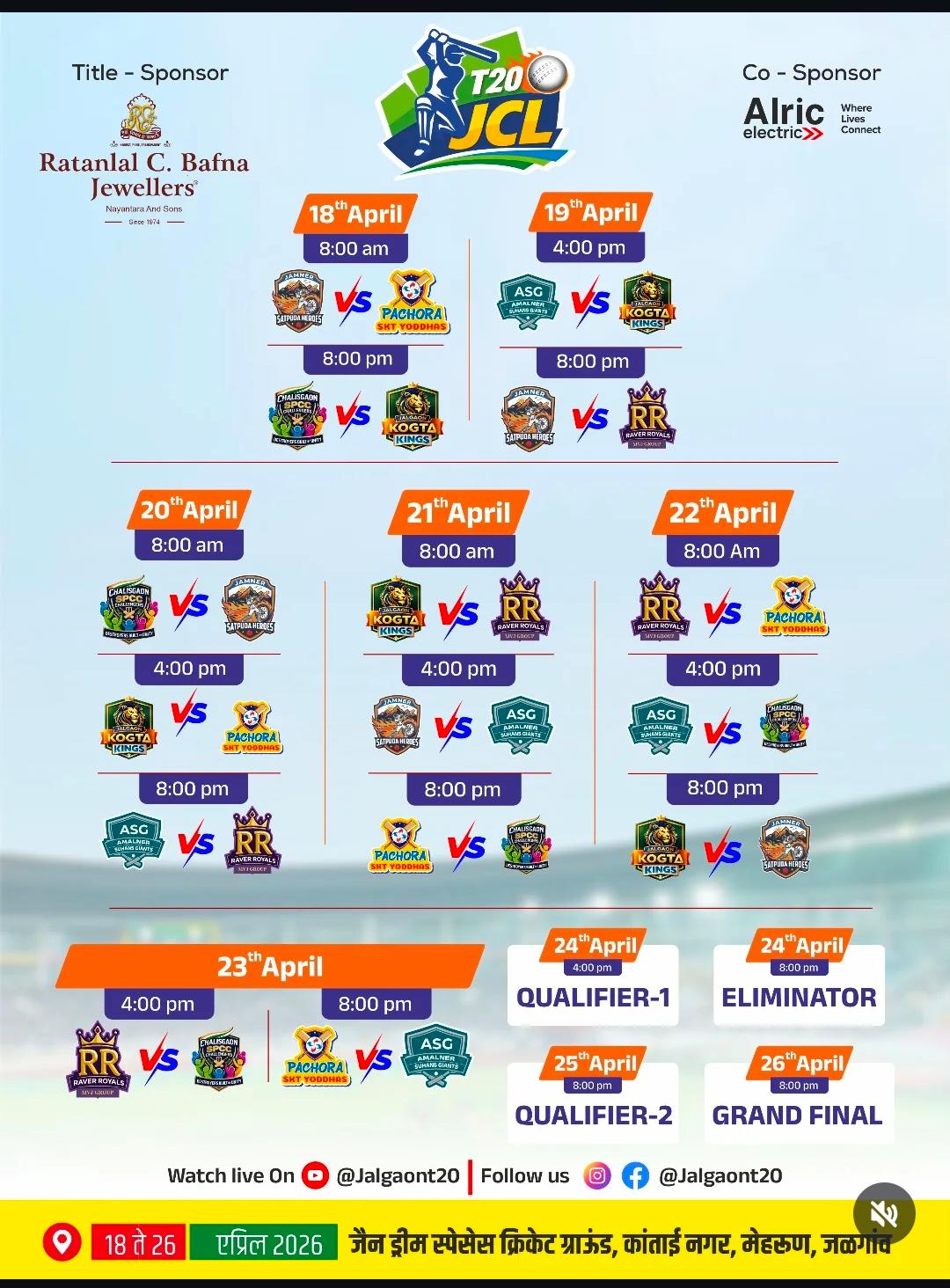 टीम झूलेलाल न्यूज़ जलगांव : जलगाँव के निवासियों में क्रिकेट को लेकर उत्साह साफ देखा जा सकता है, और यह उत्सव जैसा माहौल अब खेल के मैदान पर भी देखने को मिलेगा। जलगाँव क्रिकेट लीग (JCL) 2026 का भव्य आयोजन—जो खेल और प्रतिभाशाली खिलाड़ियों को बढ़ावा देने की एक पहल है—18 अप्रैल से 26 अप्रैल तक मेहरून झील क्षेत्र के पास, कांताई नगर में स्थित जैन ड्रीम स्पेसेस के शानदार स्पोर्ट्स कॉम्प्लेक्स में होगा। कल शाम, 18 अप्रैल को एक भव्य उद्घाटन समारोह आयोजित किया जाएगा। इस अवसर पर जल संसाधन मंत्री गिरीश महाजन; विधायक किशोर पाटिल (पचोरा), मंगेश चव्हाण (चालीसगाँव), अमोल जावले (रावेर), अनिल भाईदास पाटिल (अमलनेर), सुरेश भोले (जलगाँव शहर), और चंद्रकांत सोनवणे (चोपड़ा); साथ ही जैन इरिगेशन के चेयरमैन अशोक जैन, और जलगाँव जिला क्रिकेट संघ के संयुक्त प्रबंध निदेशक व अध्यक्ष अतुल जैन अपनी विशेष उपस्थिति से शोभा बढ़ाएँगे। इनके साथ जलगाँव जिला क्रिकेट संघ के पदाधिकारी—उपाध्यक्ष एस.टी. खैरनार, कोषाध्यक्ष राजेंद्र लड्ढा, और सचिव अरविंद देशपांडे—तथा JCL प्रबंधन टीम के सदस्य (सुयुष बुरकुल, अभंग जैन, एडवोकेट सूरज जहांगीर, हितेश पटेल, समीर गुलवे, प्रशांत विरकर, रविंद्र धर्माधिकारी, जगदीश चावला, वरुण देशपांडे, और उदय सोनवणे), BCCI अंपायर विनीत कुलकर्णी, और अन्य गणमान्य व्यक्ति जिनमें संदीप चव्हाण, संदीप गंगुरडे, मंगेश नार्वेकर, वैभव हल्दे, संतोष बडगुजर, और संदीप जारे शामिल हैं, भी उपस्थित रहेंगे। इस अवसर पर सभी टीमों के मालिक, कोच और खिलाड़ी भी मौजूद रहेंगे। छह टीमें, छह कोच, 108 खिलाड़ी जलगाँव कोगटा किंग्स टीम के मालिक प्रेम कोगटा, अतुल कोगटा और प्रणव कोगटा हैं; इस टीम में आइकॉन खिलाड़ी जगदीश ज़ोपे और कोच घनश्याम चौधरी शामिल हैं। जामनेर सतपुड़ा हीरोज़ के मालिक किरण बच्छाव हैं, जिनके साथ आइकॉन खिलाड़ी शतायु कुलकर्णी और कोच मुश्ताक अली हैं। पचोरा SKT योद्धास के मालिक हेमंत कोठारी और प्रणव कोठारी हैं; इस टीम में आइकॉन खिलाड़ी सचिन चौधरी और कोच पंकज महाजन शामिल हैं। चालीसगाँव SPCC चैलेंजर्स के मालिक सागर पार्क क्रिकेट क्लब हैं, जिनके साथ आइकॉन खिलाड़ी ओम मुंडे और कोच सचिन सोनवणे हैं। रावेर रॉयल्स के मालिक CA महावीर जैन, विमल जैन और अखिल बनवत हैं; इस टीम में आइकॉन खिलाड़ी धवल हेमनानी और कोच तनवीर अहमद शामिल हैं। अंत में, अमलनेर सुहंस जायंट्स के मालिक संदीप काबरा और श्रेयांस काबरा हैं; इस टीम में आइकॉन खिलाड़ी शुभम शर्मा और कोच राहुल निंभोरे शामिल हैं। इन्हीं छह टीमों और 108 खिलाड़ियों के बीच जलगाँव क्रिकेट लीग का भव्य आयोजन—जिसे ‘महाकुंभ’ कहा जा रहा है—शुरू होने वाला है। इंडियन प्रीमियर लीग (IPL) के नियमों पर आधारित एक विस्तृत नियमावली क