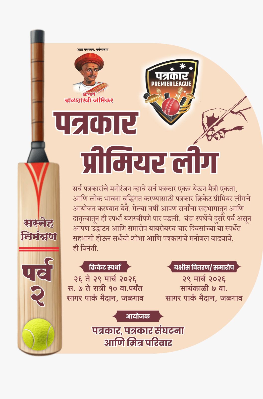 टीम झूलेलाल न्यूज़ जलगांव : जलगांव शहर में पत्रकारों के बीच खेल भावना को बढ़ावा देने के उद्देश्य से “पत्रकार प्रीमियर लीग” का भव्य आयोजन किया जा रहा है। यह प्रतियोगिता 26 मार्च से 29 मार्च 2026 तक सागर पार्क मैदान में आयोजित होगी, जिसमें शहर के पत्रकार एक साथ आकर क्रिकेट के माध्यम से एकता, मित्रता और उत्साह का परिचय देंगे। आयोजकों के अनुसार, इस लीग का मुख्य उद्देश्य पत्रकारों के बीच आपसी संबंध मजबूत करना और उनके मानसिक तनाव को कम करते हुए मनोरंजन का अवसर प्रदान करना है। पिछले वर्ष इस प्रतियोगिता को शानदार प्रतिसाद मिला था, और इसी उत्साह को देखते हुए इस वर्ष “पर्व 2” का आयोजन और भी बड़े स्तर पर किया जा रहा है। चार दिनों तक चलने वाली इस क्रिकेट प्रतियोगिता में विभिन्न टीमों के बीच रोमांचक मुकाबले देखने को मिलेंगे। आयोजकों ने सभी पत्रकार साथियों से अपील की है कि वे इस आयोजन में भाग लेकर प्रतियोगिता की शोभा बढ़ाएं और अपने खेल कौशल का प्रदर्शन करें। प्रतियोगिता का समापन 29 मार्च 2026 को शाम 7 बजे सागर पार्क मैदान में ही पुरस्कार वितरण समारोह के साथ किया जाएगा। इस आयोजन को पत्रकार, पत्रकार संगठन और मित्र परिवार द्वारा मिलकर आयोजित किया जा रहा है, जिससे यह आयोजन शहर में चर्चा का विषय बना हुआ है। Post navigation स्वीकृत नगरसेवक के लिए रमेश मताणी का नाम : सिंधी समाज मे खुशी का माहौल जलगाँव क्रिकेट लीग’ की टीमों के मालिकों और आइकॉन खिलाड़ियों की घोषणा